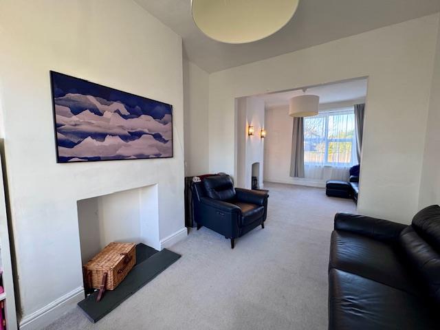 A beautiful modern large lounge, neutrally decorated with a mix of whites and greys, industrial style wall lights and two central ceiling lights. There is a lovely feature fireplace with gas fire stove and slate hearth. This rooms benefits from dual aspect double glazed windows which allows plenty of natural daylight to flood in, two radiators and ample power points.