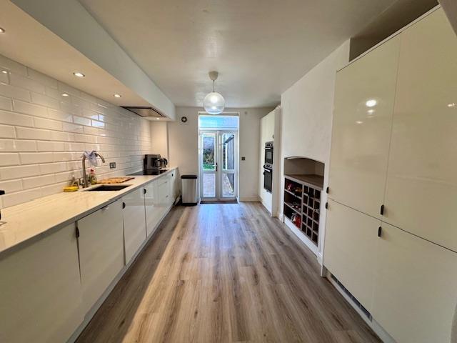 A stunning family kitchen fitted with a range of modern wall and base units, integrated dishwasher, Bosch oven and microwave, Bosch induction hob and remote control Neff extractor fan. White pillar box style tiled splash back, central ceiling light and downlights. With open chimney breast fitted with display shelving and wine rack. UPVC glazed patio doors provide access tot he outside space.
