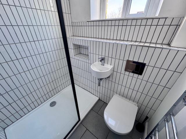 Access from the ground floor with plumbing for washing machine and space for further appliances if required. Wall mounted boiler, sink and w/c and chrome ladder towel radiator.