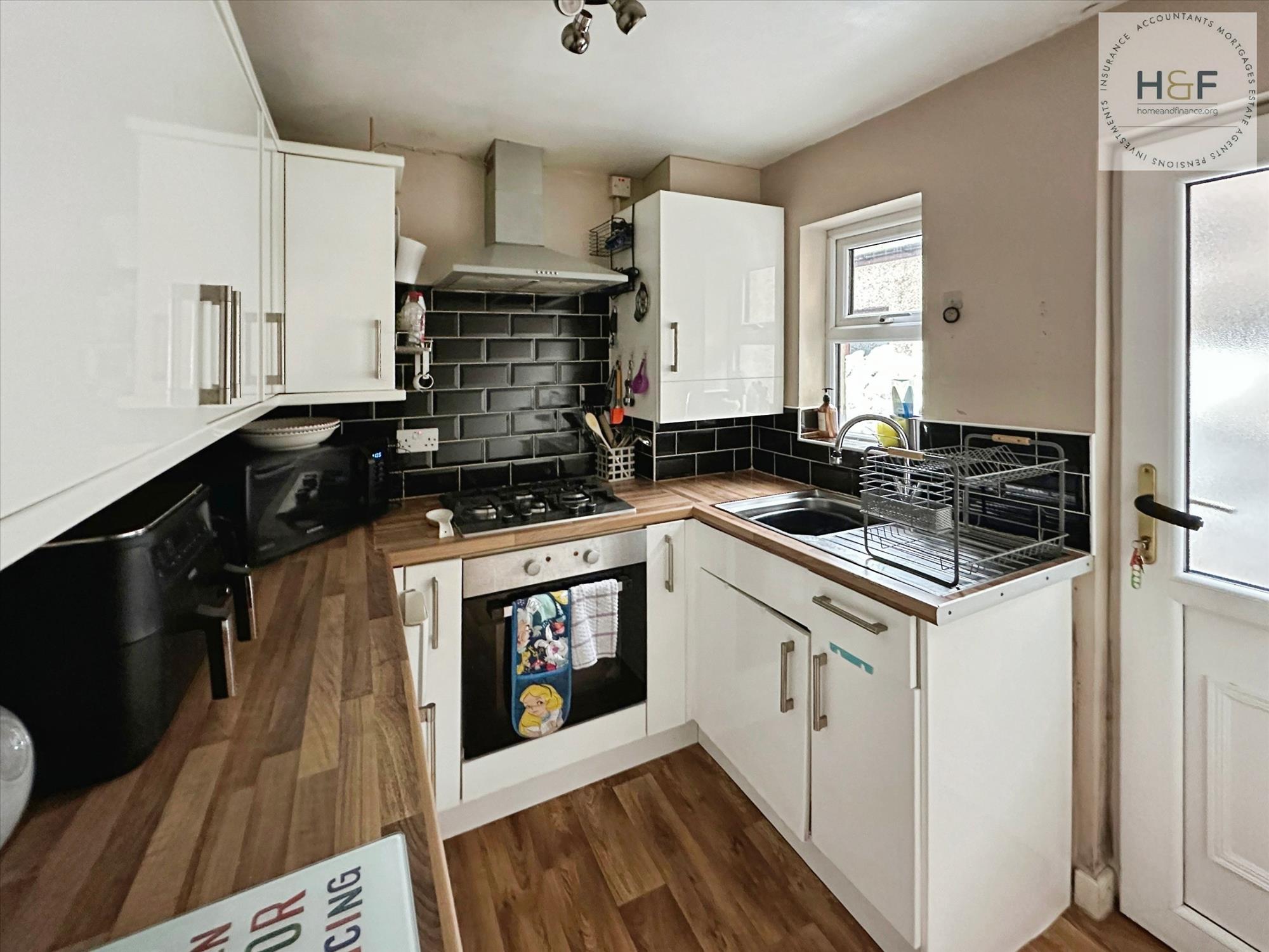 The kitchen has a range of base and wall units, wood effect worktop and black pillar box style tiled splashbacks, with built in oven, hob and extractor. Wall mounted boiler, sink with drainer and central ceiling light. Upvc window to the side elevation and Upvc part glazed door giving direct access to the rear yard.