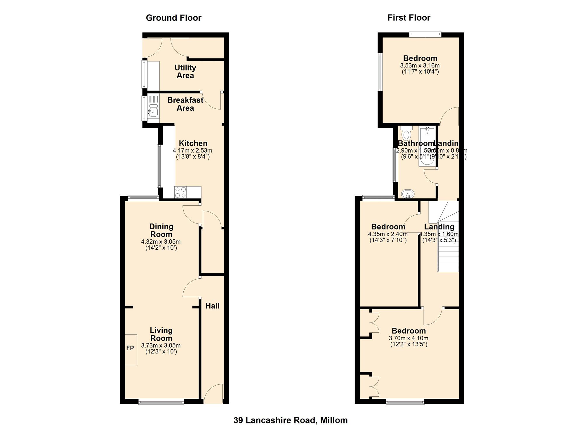 A good size lounge/dining room with Upvc window to the front and rear aspect. Central feature fireplace with inset gas fire, carpet to floor, two radiators, power and lights.