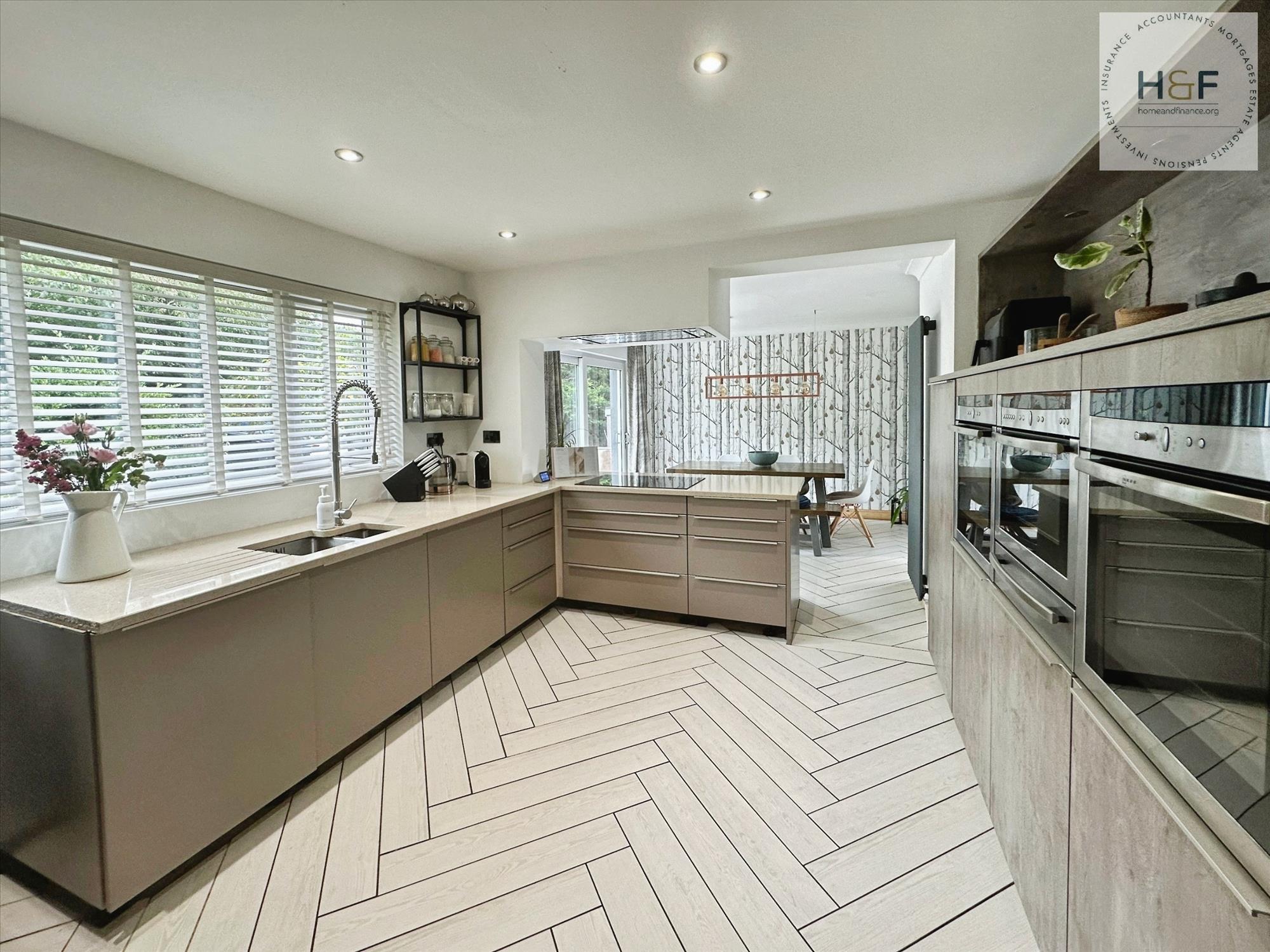 The real heart of the home is this fantastic open plan dining kitchen, with large Upvc window with views over the rear garden and patio doors to the dining area which lead out to the garden. This gorgeous kitchen features modern Mushroom coloured base units to one side with inset sink, induction hob, dishwasher and space for American fridge/freezer, while to the adjacent wall there are matt kitchen units which are home to the integrated appliances which include two ovens, microwave and plate warmer. Stylish tiled flooring with under floor heating continues into the dining area which has ample space for dining table and chairs. Downlights, ceiling light, matt grey ladder radiator and archway to the lounge.