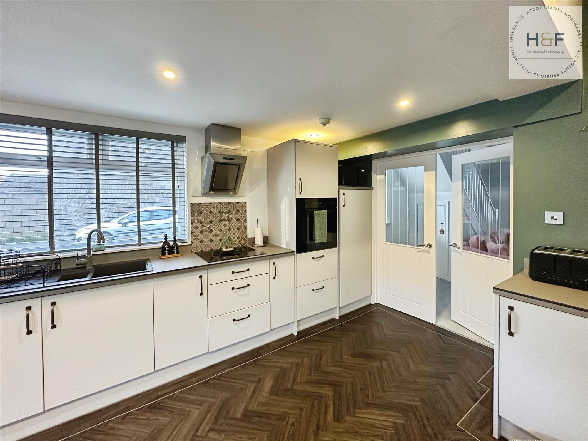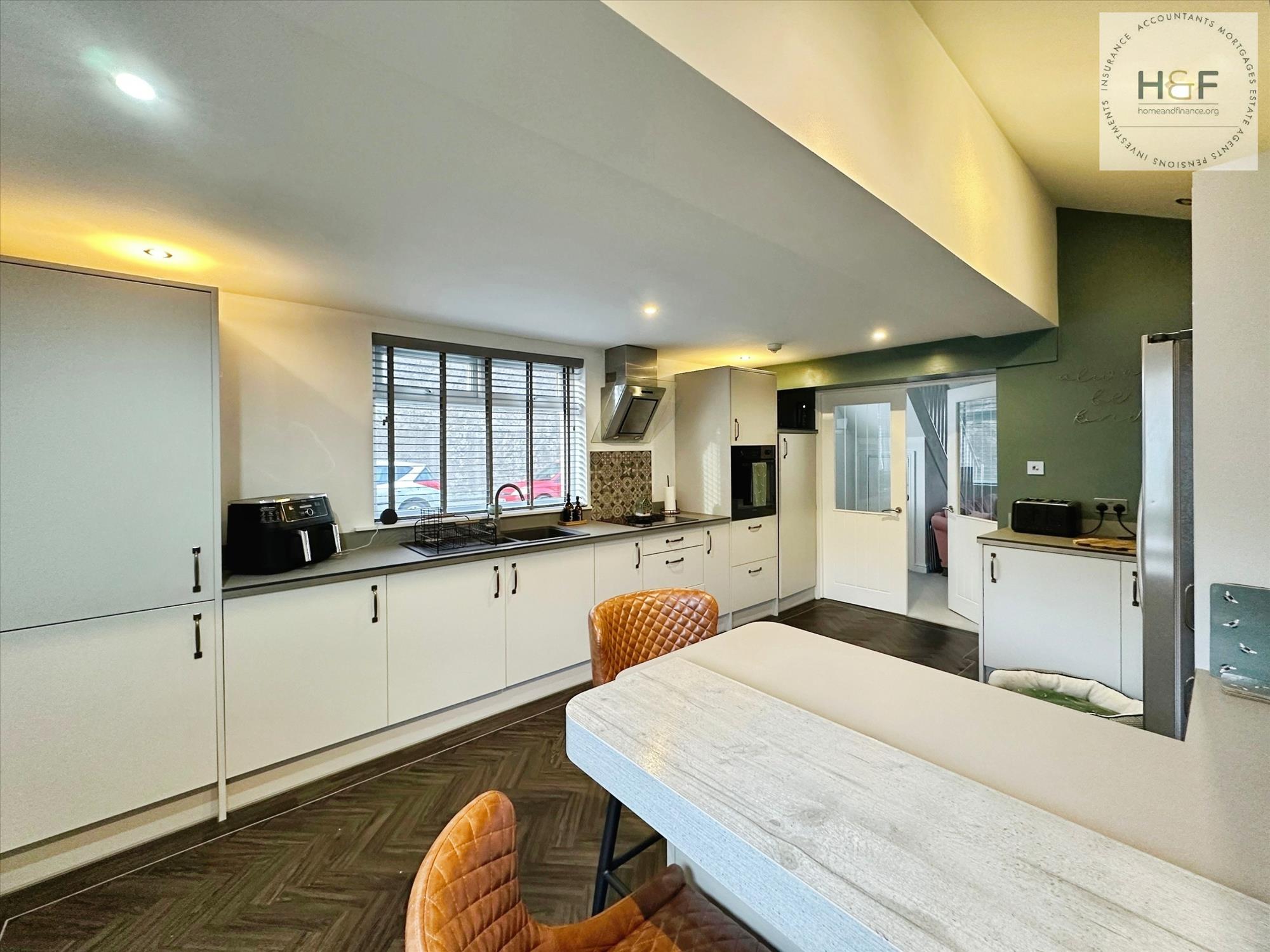 This lovely large open plan lounge is neutrally decorated with matching grey carpet, pretty wallpapered chimney breast and gorgeous feature fireplace with woodburner. Dual aspect Upvc windows to the front and side elevation allow lots of natural light to fill the room. Open staircase to the first floor landing, understairs storage cupboard and double doors which lead to the dining kitchen.