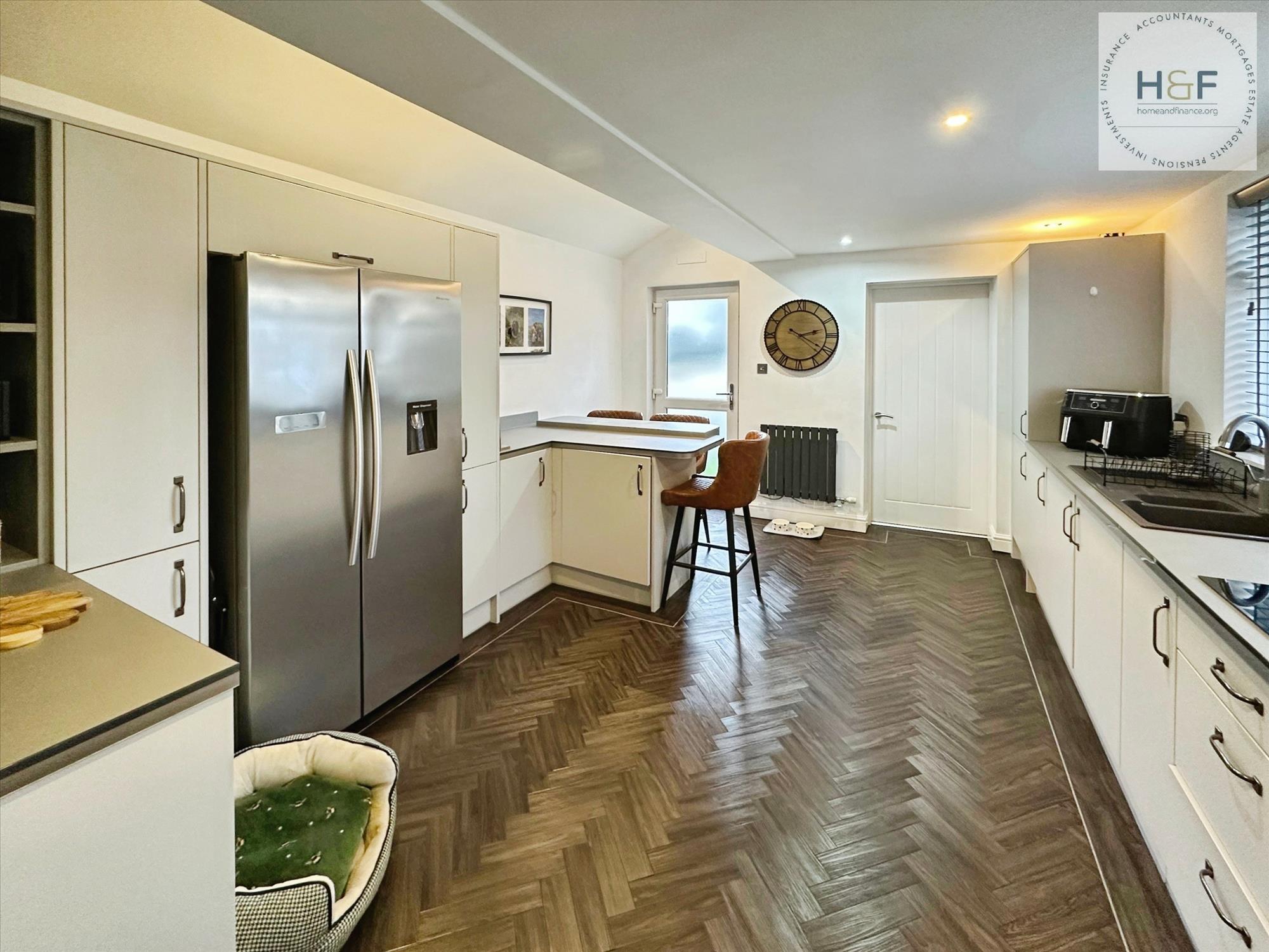 This stunning kitchen features a fantastic range of modern grey units including larder and deep drawers, with inset one and half bowl sink with drainer, built in eye level oven, hob and angled extractor. With space for an American fridge freezer, wall mounted boiler which is housed in one of the kitchen cabinets and breakfast bar ideal for those morning coffees. Upvc double glazed window to the side elevation and Upvc glazed door to the rear patio garden.