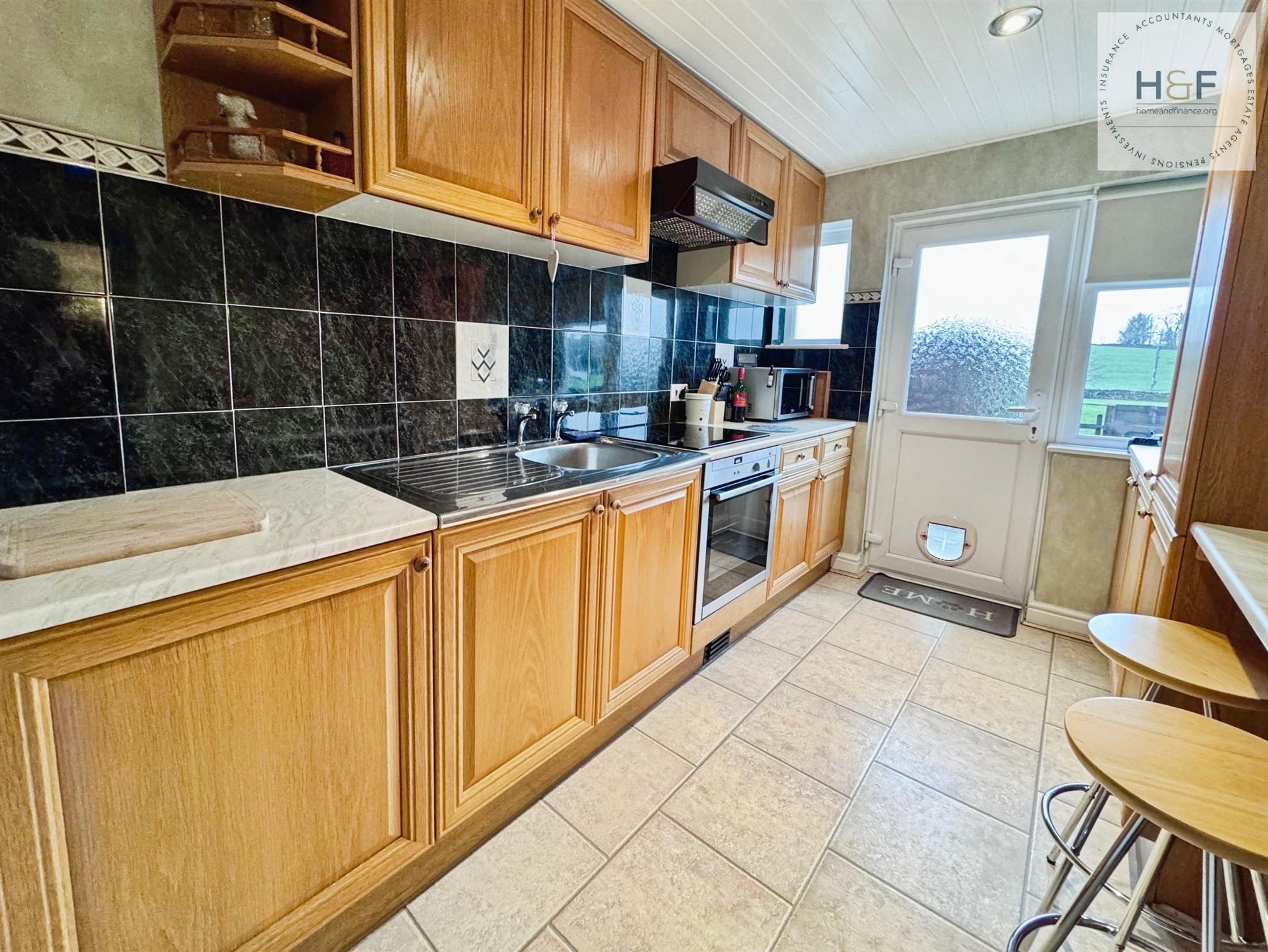 Fitted breakfast kitchen with a good range of wall and base units in light oak with contrasting work surface and splash back tiling to the walls. Additional benefits include stainless steel sink unit, breakfast bar area, integral electric oven and hob, radiator and tile effect click flooring. Upvc window and door to the rear aspect out to the garden.