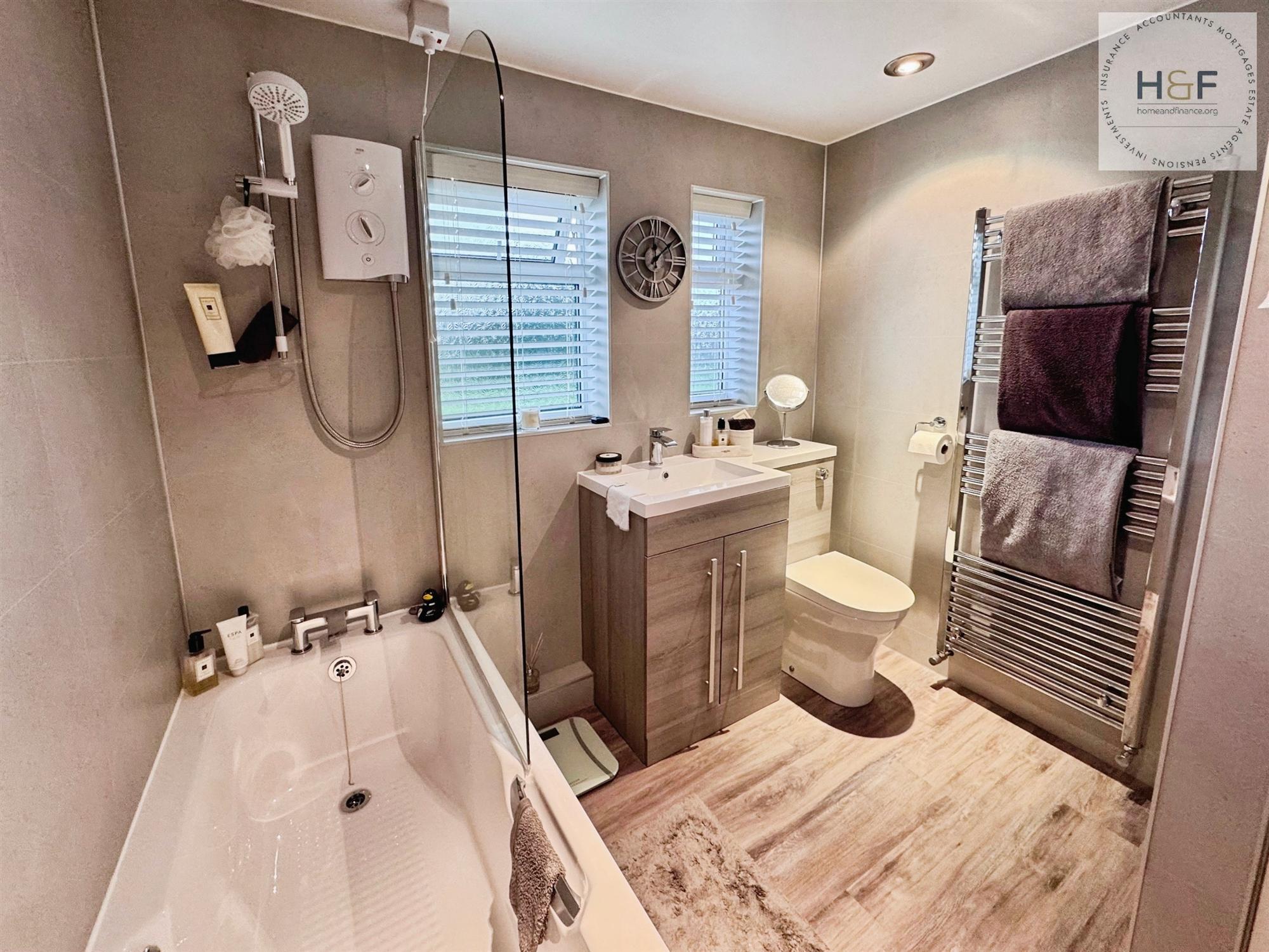Modern contemporary bathroom suite comprising of bath with over bath electric shower, vanity sink and wc unit, chrome accessories, tile effect panelling to the walls and grey washed wood effect flooring. Two Upvc double glazed windows to the rear aspect, down lights to the ceiling and chrome towel radiator.