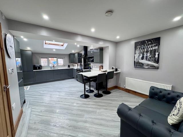 Entrance to the property is via composite door leading into the entrance hall with stairs to first floor landing, and grey washed wood laminate flooring. Access into the cosy lounge with central fire place with floating oak mantel and inset multi fuel burner. decorated in neutral grey tones, carpet to floor, radiator, power and light. Oak glazed panel door provides access through to the kitchen/family room.