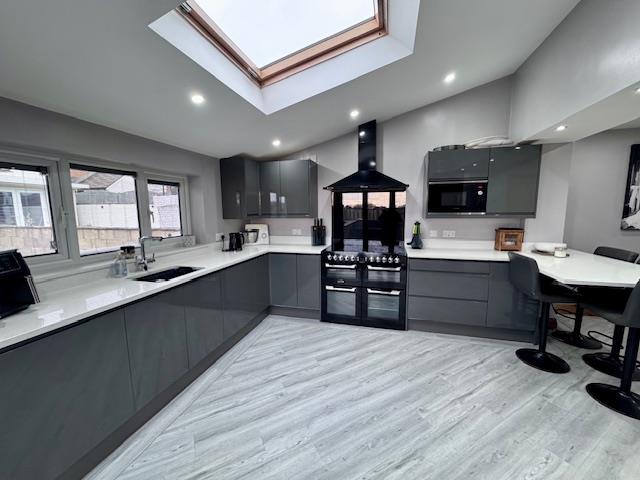 The real heart of this family home is this stylish open plan dining/ kitchen/family room. This space has been designed to cater for modern living, featuring a good range of sleek grey wall and base units with contrasting quartz work surfaces with inset sink unit with mixer tap. Additional benefits include integral fridge, microwave, dishwasher and washer. The vendor has indicated that the electric range cooker will be included in the sale. Upvc double glazed window to the rear and large Velux roof light let in plenty of light along with Bi Fold doors to the side providing access out to the patio and garden. Karndean flooring runs throughout, under stairs storage, radiator and downlights to ceiling.