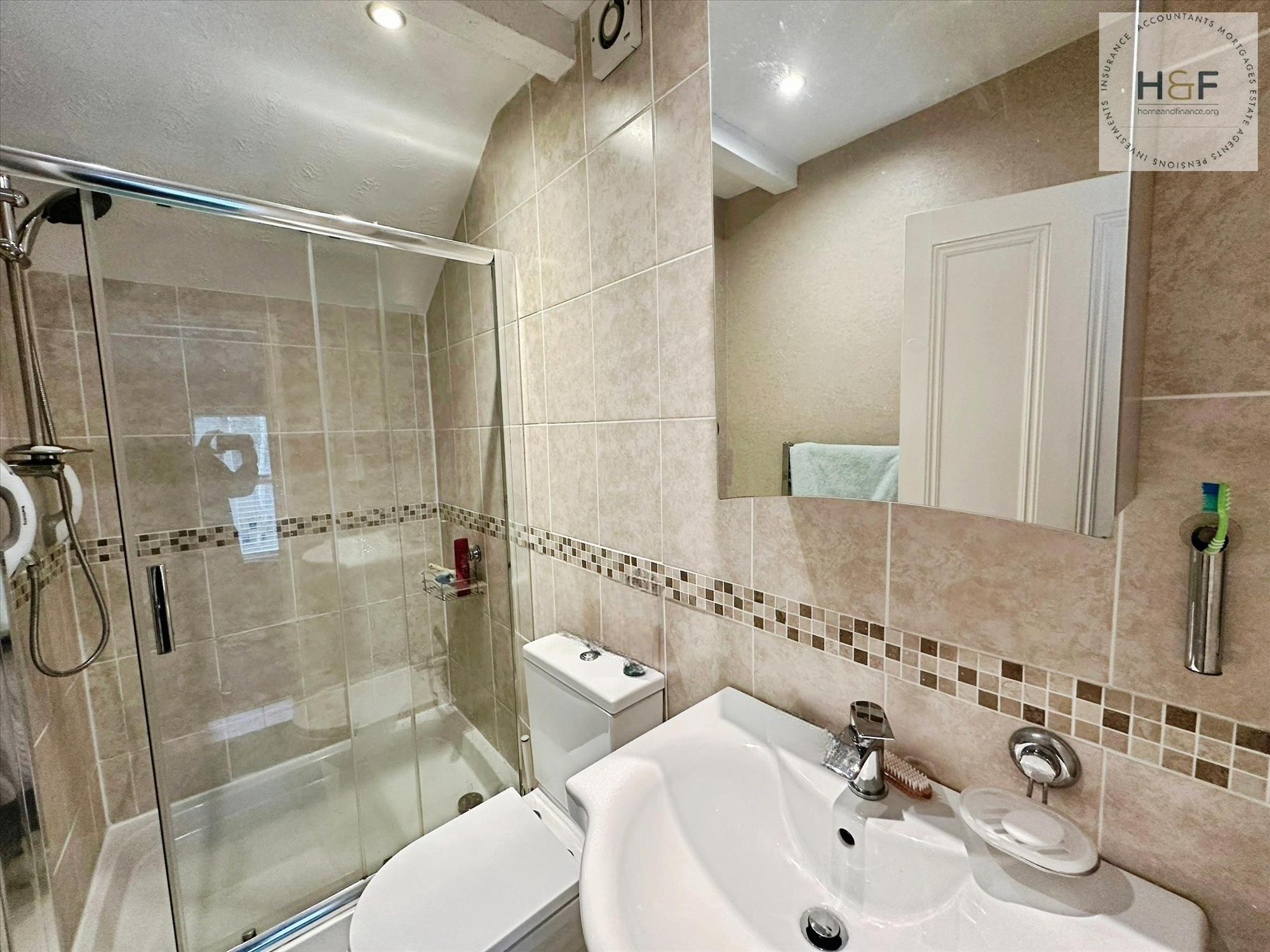 Fitted with a white three piece suite including bath with over bath shower, shower screen wc and sink. Tiled walls and floor, downlights and chrome ladder towel radiator.